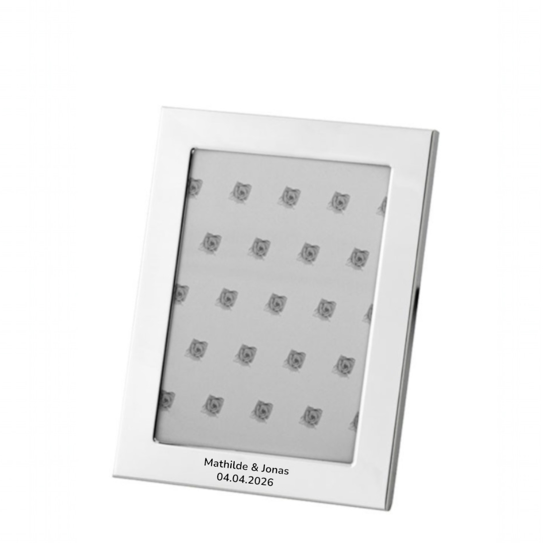 Eksklusiv og stilren forsølvet billederamme med plads til et smukt minde. Forær fotorammen med en personlig indgravering til enten brudeparret, bedsteforældrene eller til barnet der skal døbes. Vi indgraverer gratis nederst på rammen. Med denne smukke forsølvet billedramme med navn,  er der mulighed for at holde fast i de smukkeste minder.