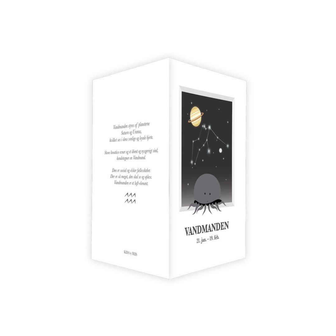 Sødt A6 dobbeltkort med personlig tekst der passer til stjernetegnet "Vandmanden" fra Kids By Friis. Se stjernebilledet og læs hvilken planet og element der hører til stjernetegnet. Kortet med stjernetegn er super fint til den personlige gave, eller til indramning ved siden af de fine A3 plakater med samme motiv.