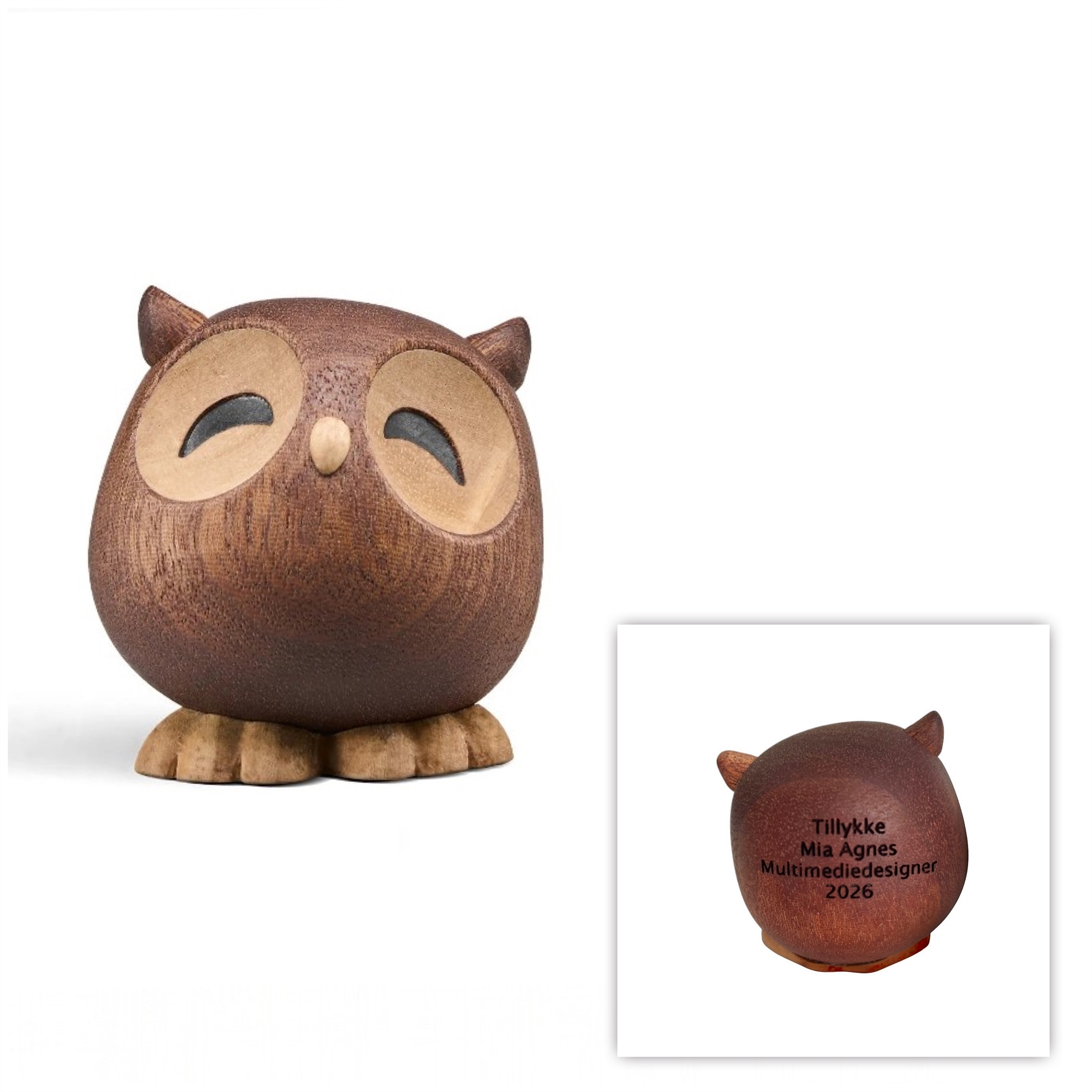 Gratis gravering: Personliggør ved lasergravering med et navn og/eller en dato. Graveringen vil stå på uglens ryg og fremstå i en mørk tone. OBS - pladsen er begrænset - max 17 tegn pr. linie.
