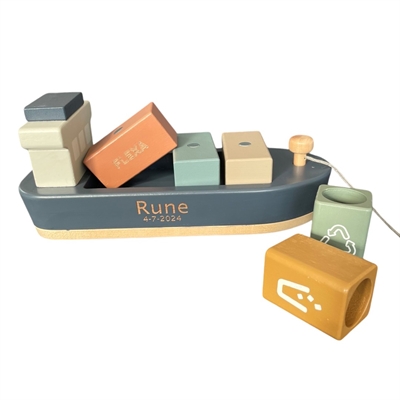 FLEXA container skib i træ er en perfekt personlig gave til det nysgerrige barn. Forær skibet med personlig indgravering af barnets navn, en dato eller et lille citat. Trælegetøjet er designet til at stimulere dit barns fantasifulde leg og samtidig forbedre dets finmotorik og rumlige bevidsthed. Dit barn kan læsse og organisere fem containere på det store skib og lade som om, det sejler til fjerne lande med sin dyrebare last. Skibets containere og affaldsspande kan på- og aflæsses med en magnet.