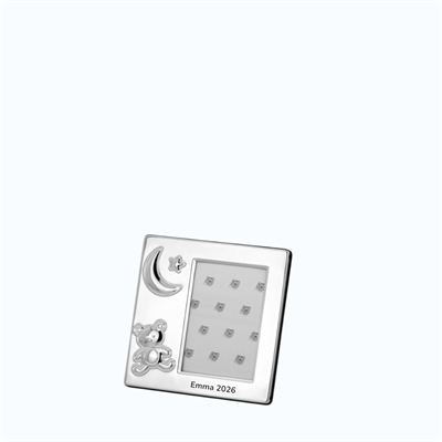 Kær forsølvet fotoramme med plads til billede af barnets første tid. Fotorammen er dekoreret med en sød bamse med måne og stjerne. Forær fotorammen med en personlig indgravering af barnets navn nederst på rammen. Med denne smukke billedramme med navn er der mulighed for at holde fast i de smukkeste minder. Fotorammen med navn er oplagt som en personlig dåbs-, barsels eller fødselsdagsgave.