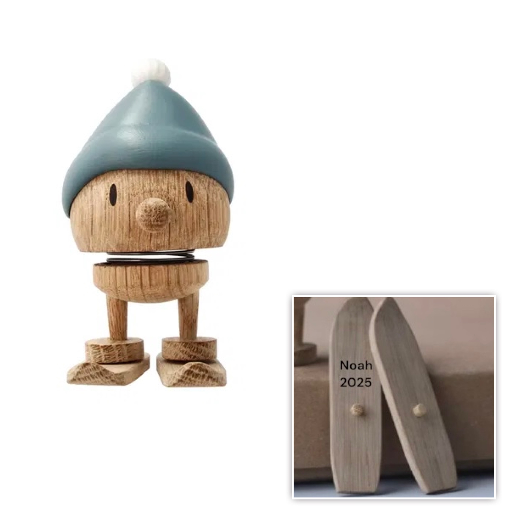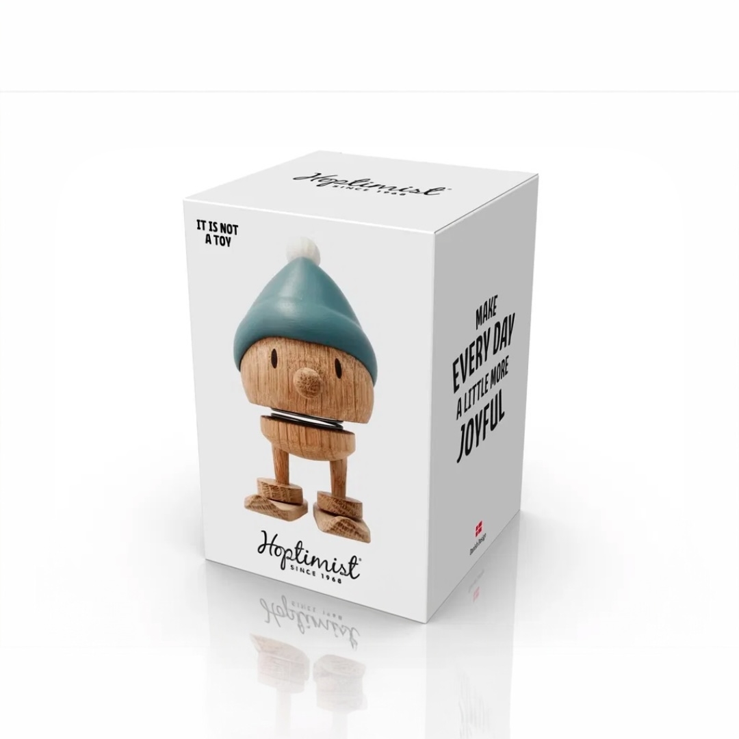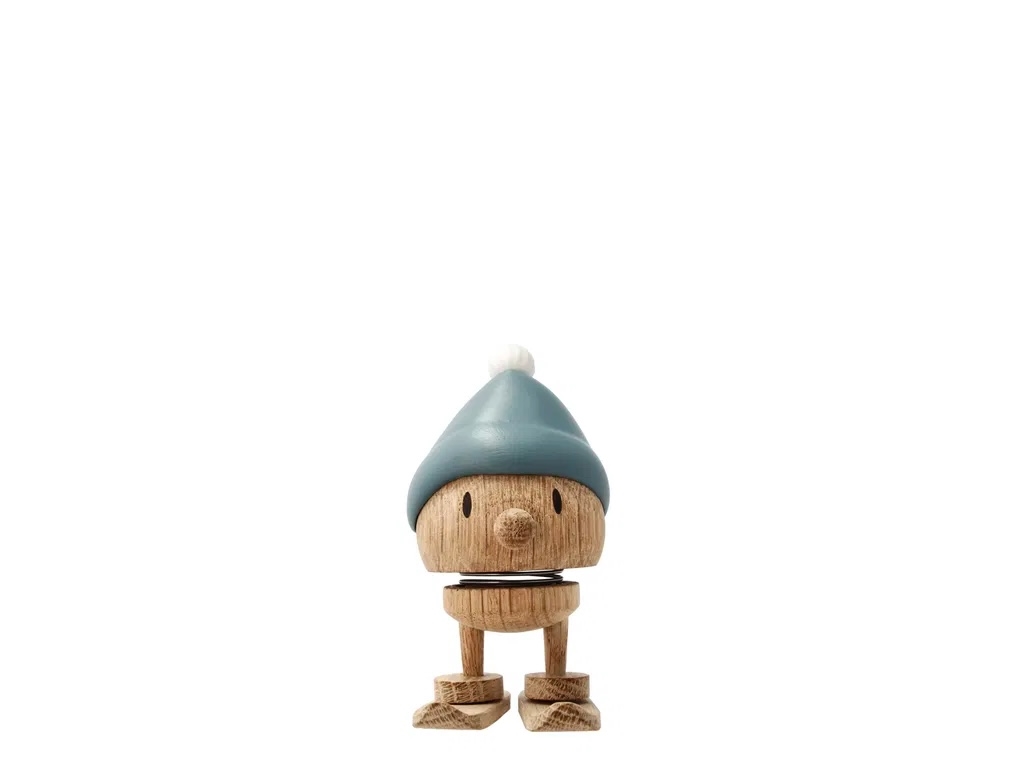 Sød lille Hoptimist Bumle med blå hue og ski i egetræ. Bumle er klar til at sprede glæde og sætte smil på alles læber når de fine personlige ski klikkes på. Figuren kan både stå med og uden ski og på en måde skifte udtryk. Ønsker du at gaven skal være personlig, graverer vi gerne gratis træfiguren for dig. På denne hoptimist vil graveringen stå på den ene ski. Hoptimisten med navn er en populær gave til jule-værtsgave, julepynt, advents- og pakkekalendergave eller bare fordi. En unik gave til den du holder af.