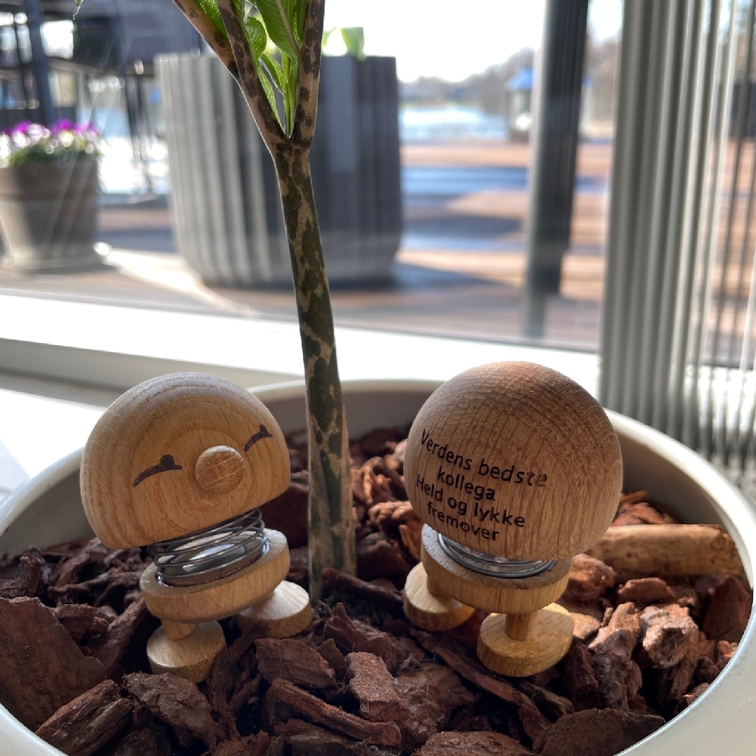 Sød lille Hoptimist Bimle i egetræ. Leveres i flot gaveæske og er skabt til at sprede glæde og sætte smil på alles læber. Ønsker du at gaven skal være personlig, lasergraverer vi gerne træfiguren gratis for dig.