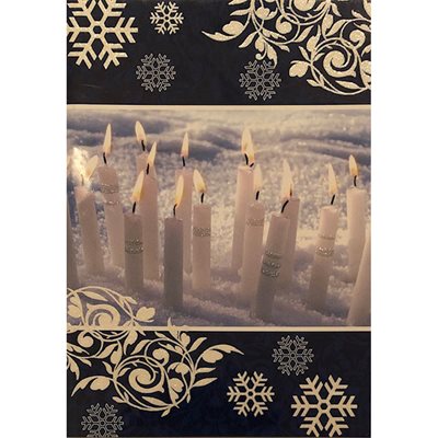 Flot julekort i blå og hvide nuancer med perlemor farvet kuvert. Kortet er pyntet med perlemor glimmer.