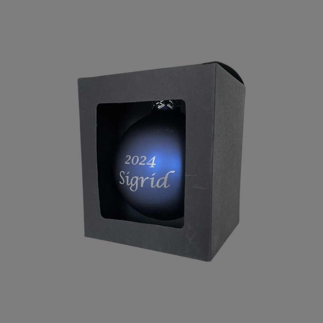 Giv dem du holder af en personlig julekugle med navn. Julekuglen er fremstillet af glas i høj kvalitet, hånddyppet og måler 8 cm i diameter. Vælger du at få leveret med gravering, vil denne være fremstillet med laser og derved være permanent. Julekuglerne fås i et vælg af farver, som findes i både mat og blank udgave. Hver enkelt julekugle leveres i en flot sort gaveæske. Se også vores julekugleholder, som kan pynte på hylden med den indgraverede julekugle - se den her.