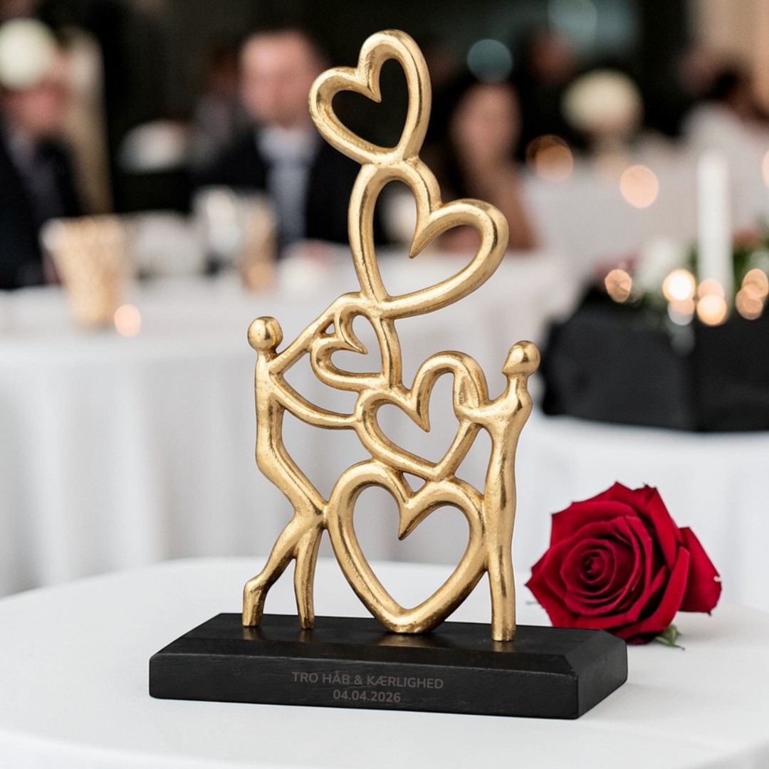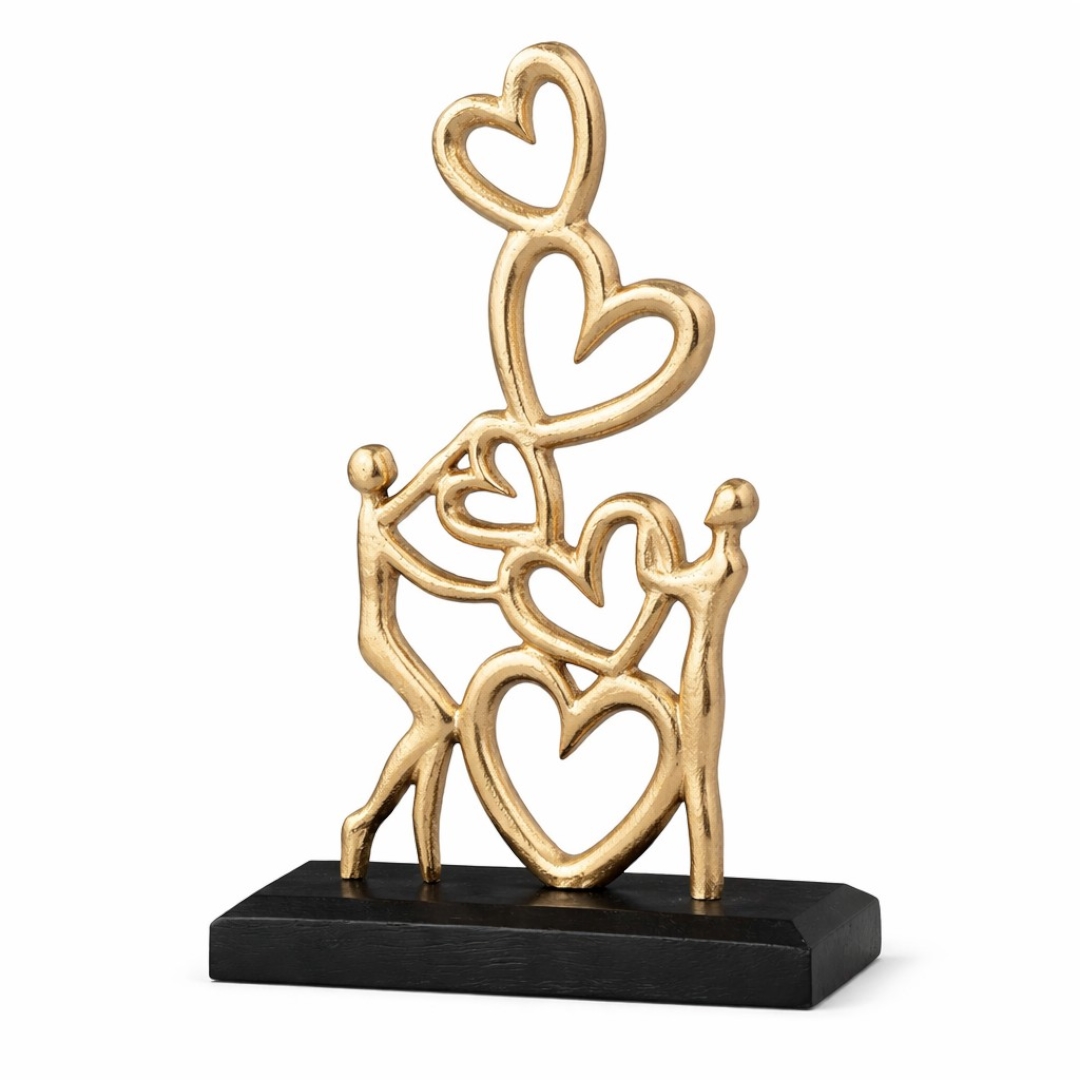 Håndfremstillet skulptur i guldmetal på sort træfod. Figuren forestiller 2 mennesker som holder 4 små hjerter mellem dem. Forær figuren med personlighed - få indgraveret navne, en dato eller en hilsen på træfoden og glæd den eller dem du holder af.