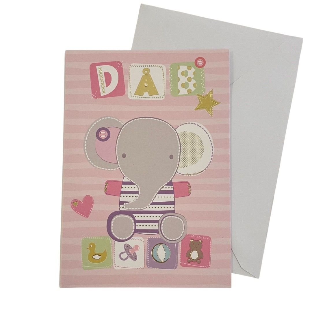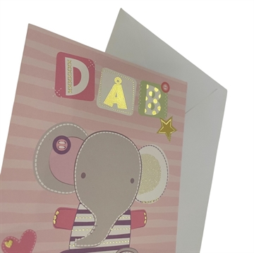 Sødt lykønskningskort til barnets dåbsdag inkl. kuvert. Lyserødt kort med guld skinnende ikoner. Elefant med legetøj.
