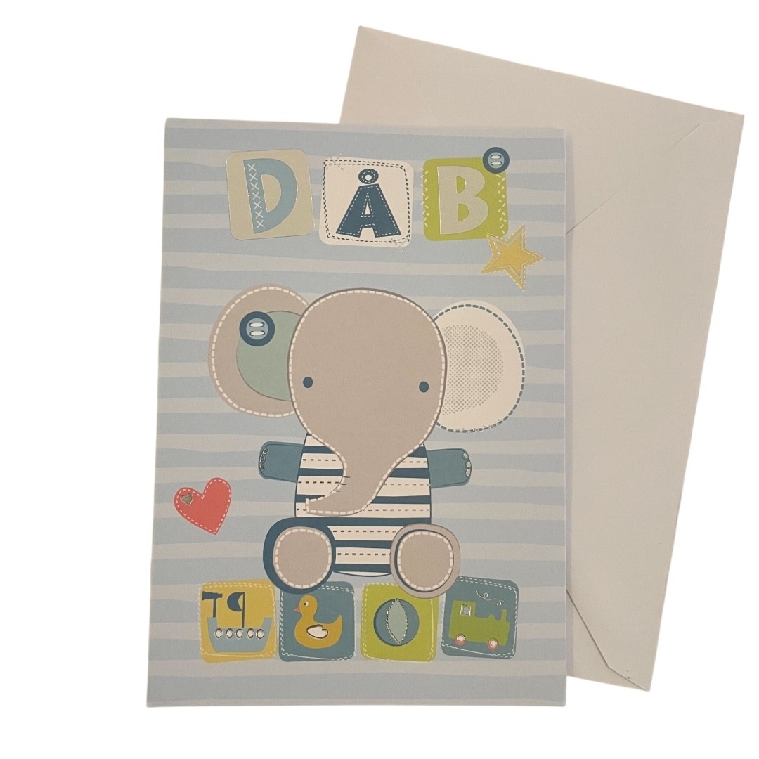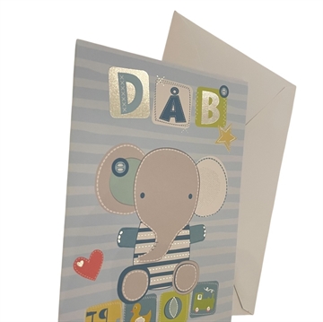 Sødt lykønskningskort til barnets dåbsdag inkl. kuvert. Lyseblåt kort med sølv skinnende ikoner. Elefant med legetøj.