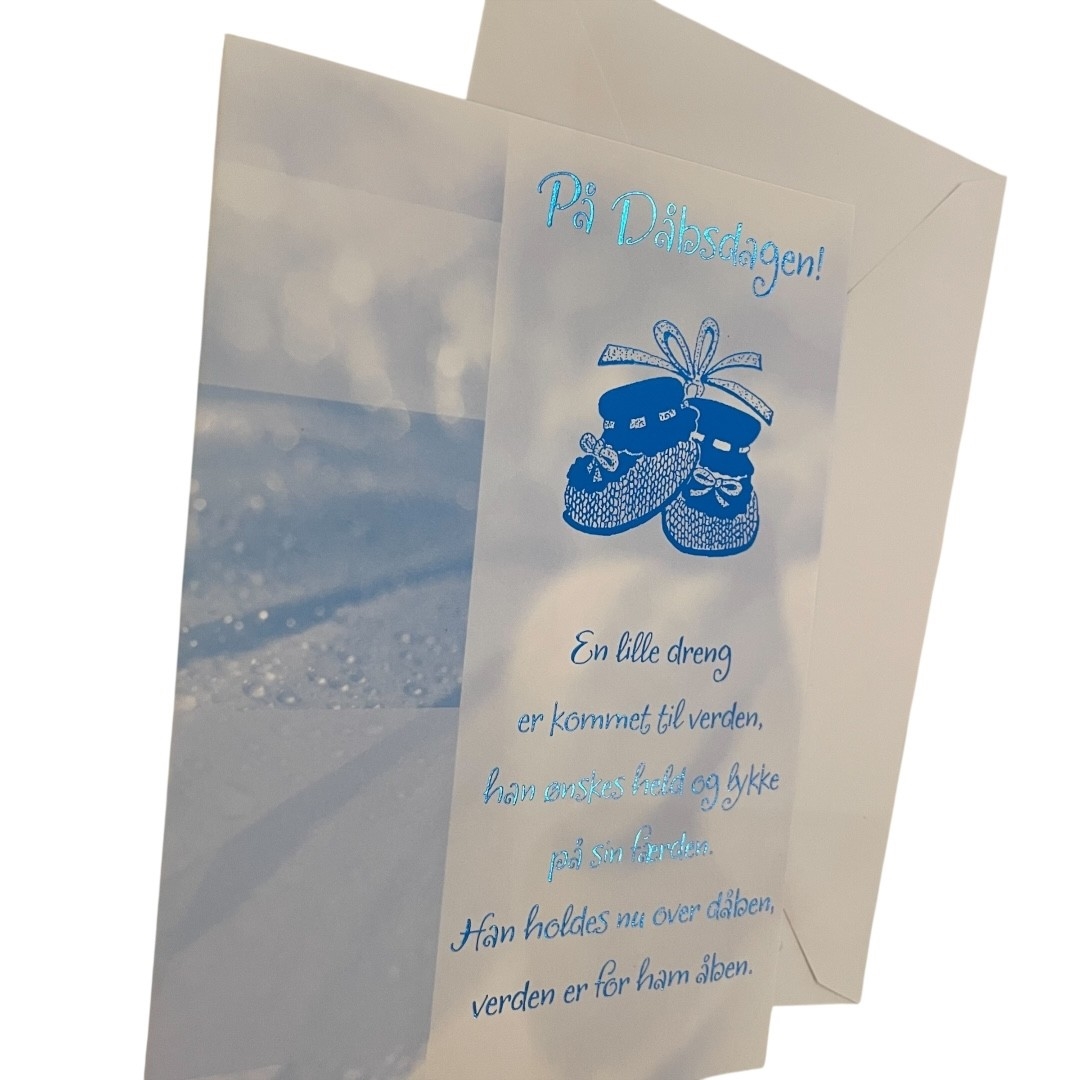 Sødt lykønskningskort til barnets dåbsdag. Lyseblåt kort med skinnende lyseblå tekst samt sko inkl. hvid kuvert.