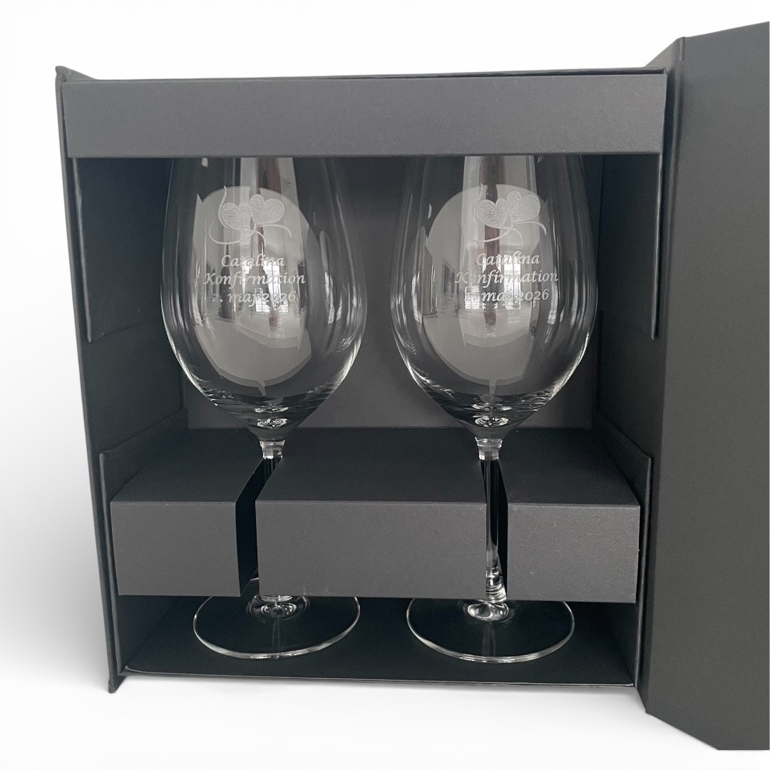 Overrask dem du holder af med 2 stk. personlige rødvinsglas i flot gaveæske. Her er der rig mulighed for at sætte eget præg på glassene enten med et lille citat, dine venners, forældres eller bedsteforældres navne. Mulighederne er mange.
