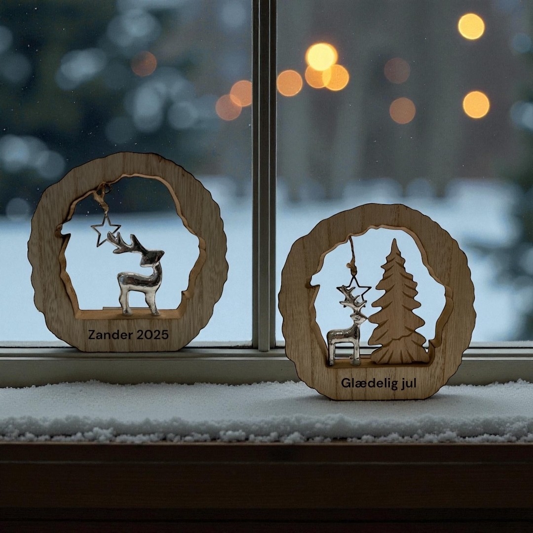 Dekorativt julepynt med rensdyr og stjerne i sølvfarve og juletræ i træring. Forær julepyntet med unik gravering og giv den du holder af en yderst personlig gave. Træringen kan graveres med navn, en dato eller en lille hilsen. Julepyntet med navn måler 14 cm og er en perfekt gave til dit barn, barnebarn, bedsteforældre eller som en værtindegave.